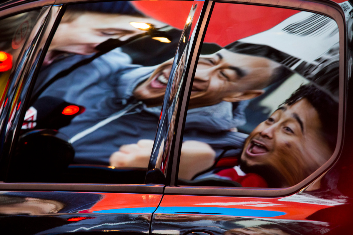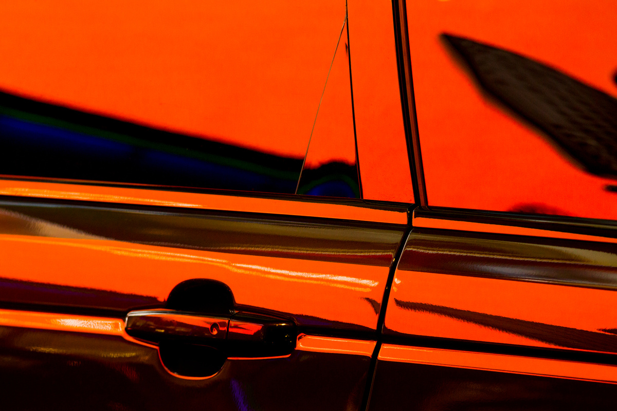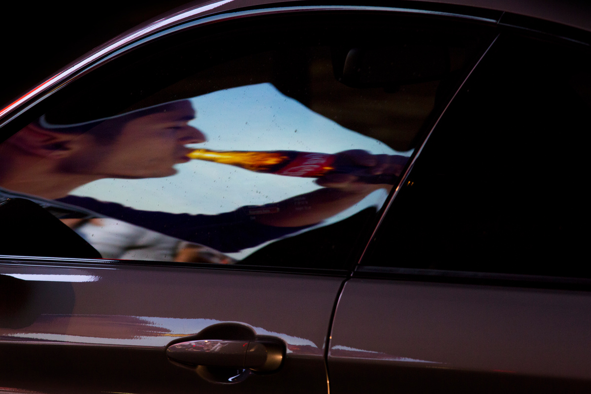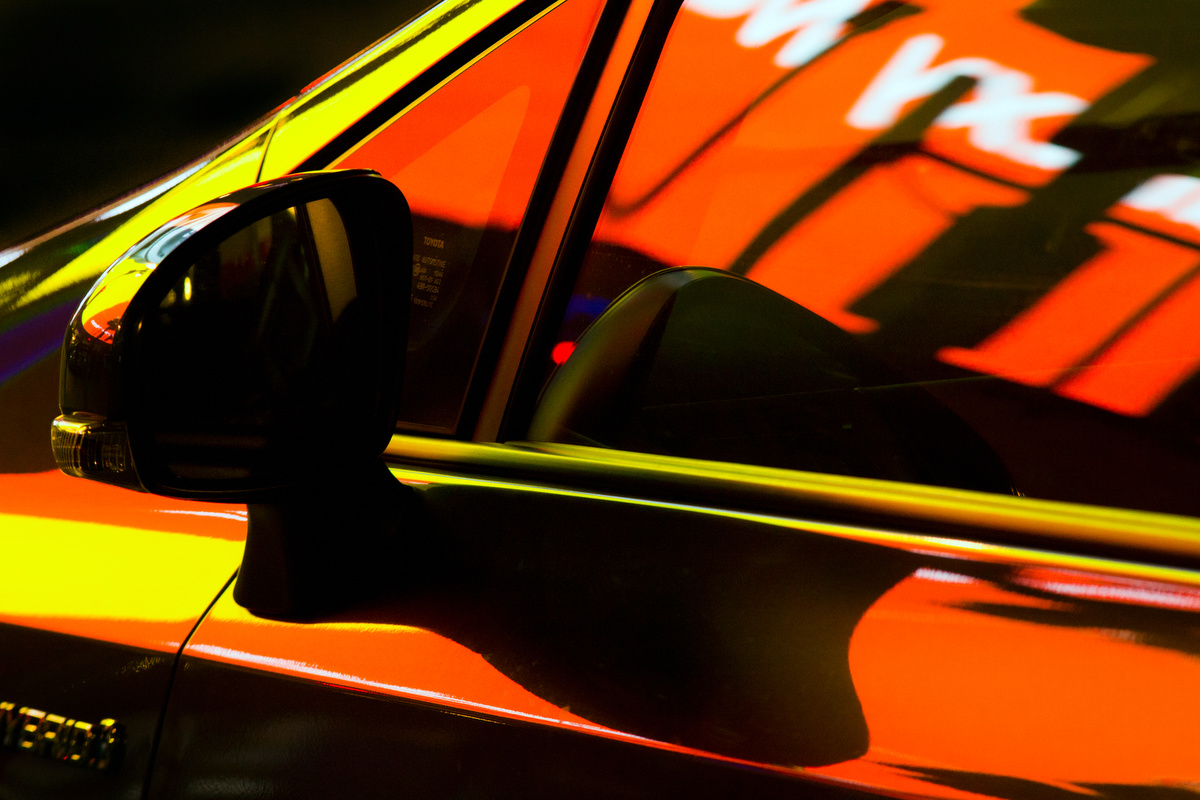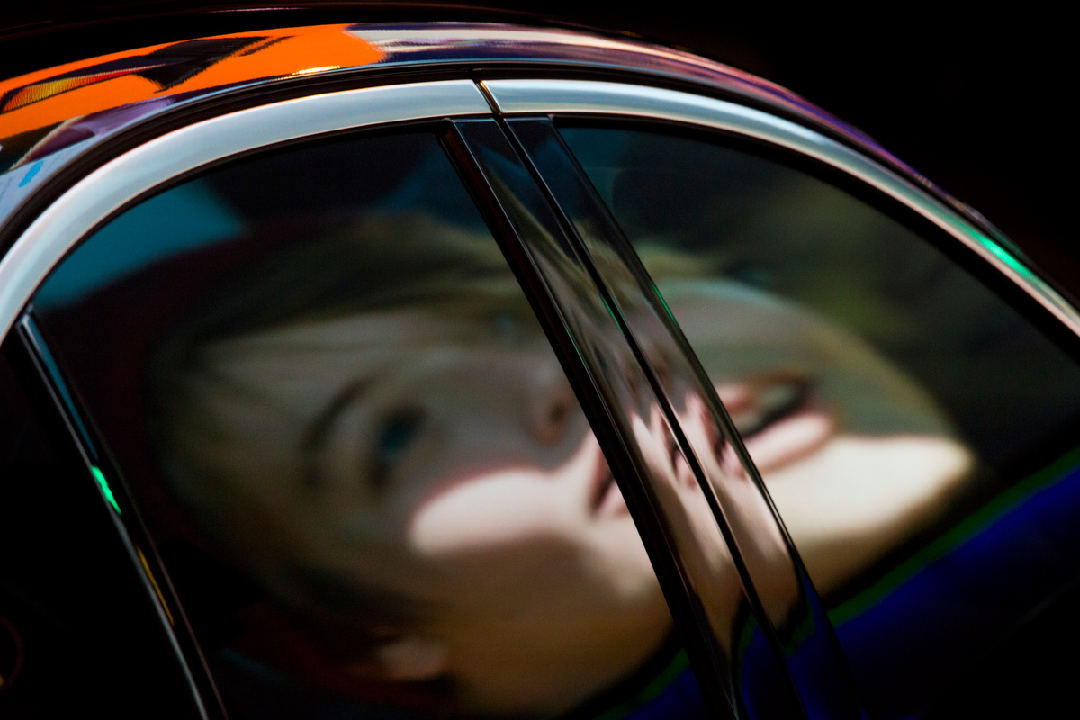 This project brings together two of the most prominent aspects of life in the metropolis, advertising and the automobile. Shiny new vehicles passing through the city are illuminated by huge bright screens of Coca Cola red, Samsung Orange and Xbox green. The light on the bodywork reminiscent of the ‘liquid light’ effect of much car advertising photography. These are documentary pictures of the everyday that echo the aesthetic of the high end commercial photography studio.
